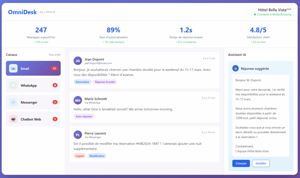 j-AIme.fr révolutionne la gestion de la relation client dans l’hôtellerie avec OmniDesk, une solution d’automatisation intelligente des communications clients propulsée par l’IA.